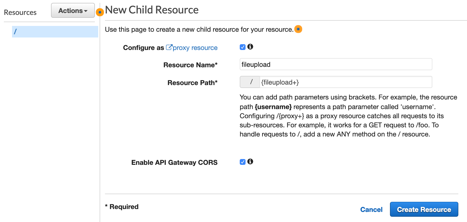 After creating my API, I need to create a resource and method. Go to 'Resources' in your newly created API, and choose 'Create Resource' from the Actions menu. As shown in the image below, we want to set up this Resource as a 'proxy resource'. As such, we need to give it a unique path. The resource path must fit the following naming convention: {name+}. I chose to name this example {fileupload+}. We also want to enable CORS. Note that you can only have one Lambda Proxy per resource; if you ever try to create a second proxy under the same resource path, you'll get an error.