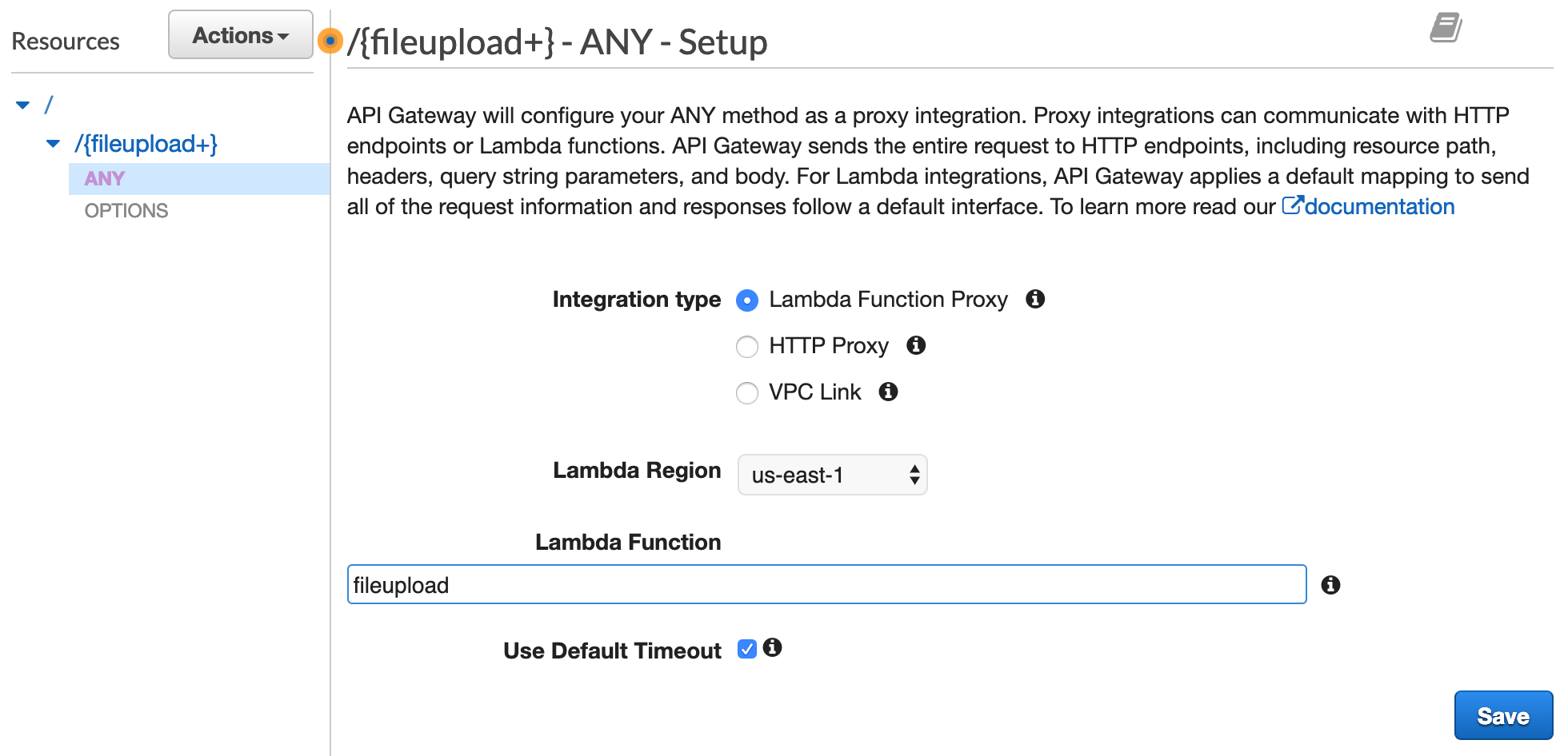 The 'Integration type' will already be set to 'Lambda Function Proxy'. Choose your region, and start typing the name you gave the Lambda Function -e.g. fileupload. Then click save.