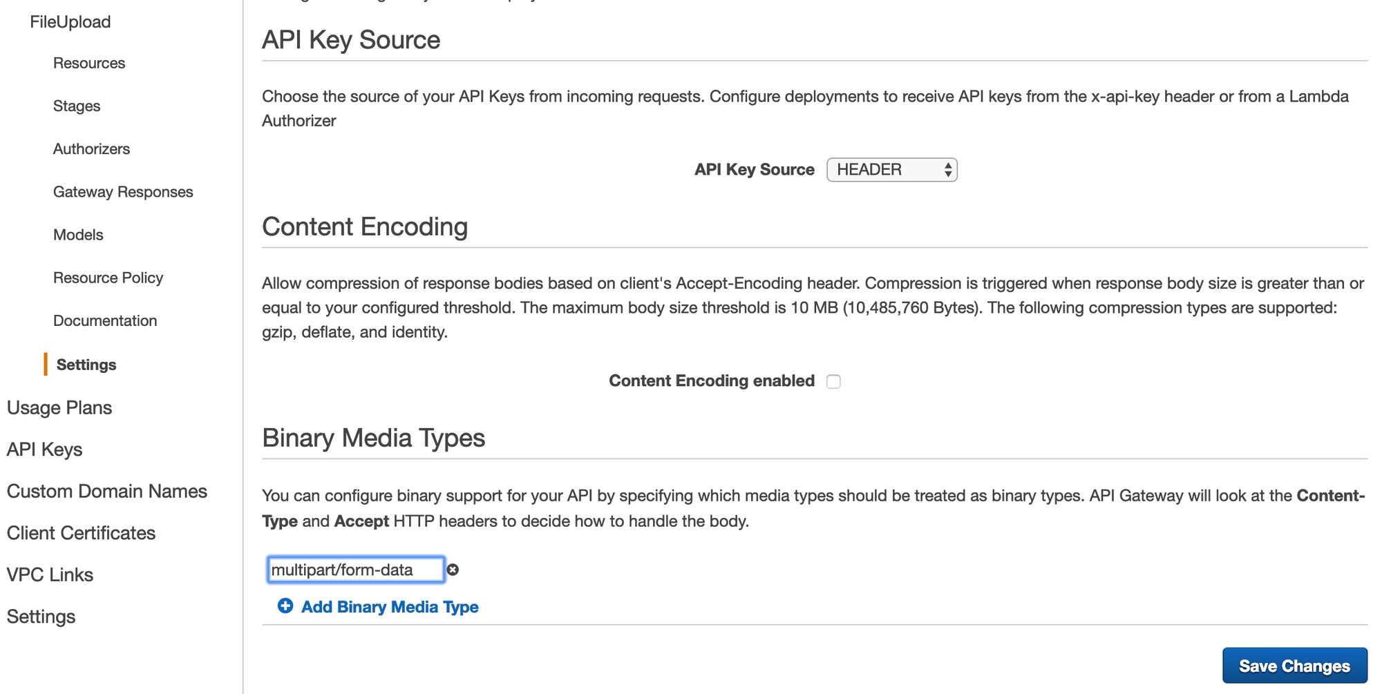 Next, we need to tell API Gateway that it should handle multipart/form-data as a binary data type. To do that, go to Settings under your API as shown below. Look under Binary Media Types, and add 'multipart/form-data' to the list. Then save this change.