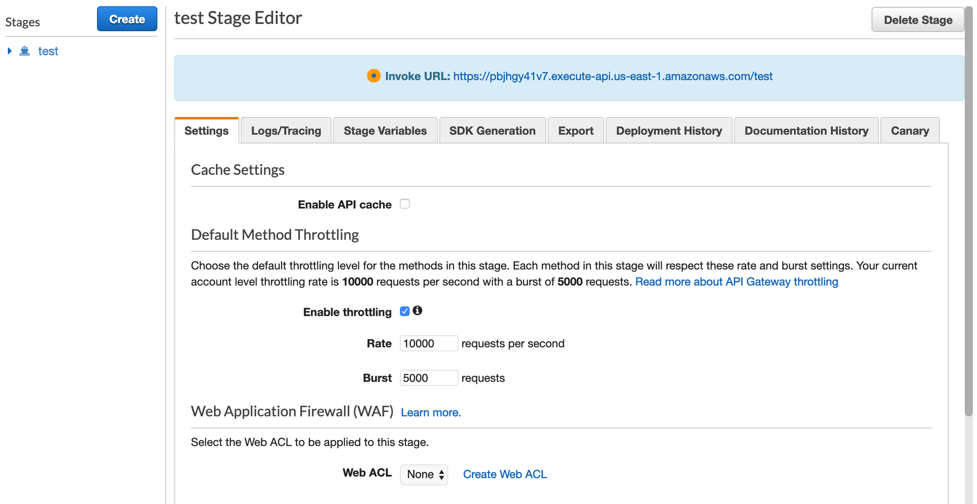 After deploying the stage, we'll look for our 'Invoke Url'. This can be found by clicking our 'test' stage after it is created, as shown in the blue banner near the top of the screenshot below.
