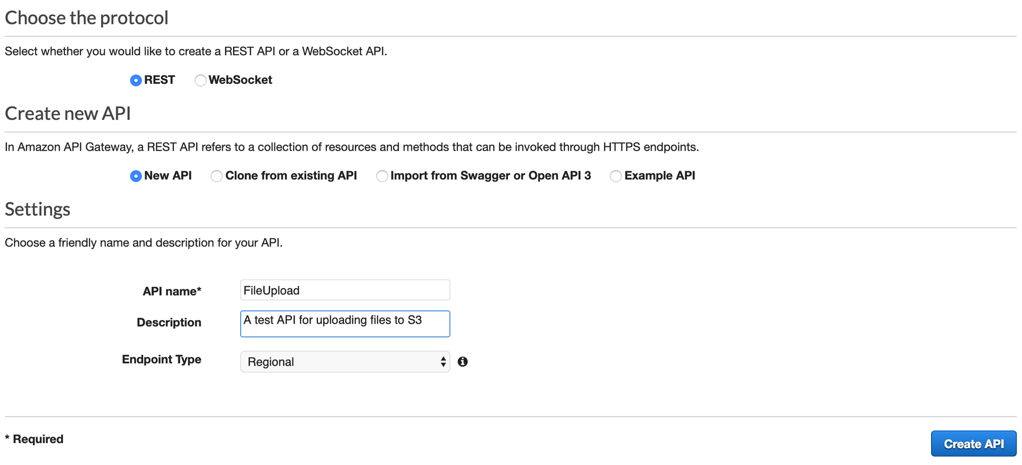 First, we'll create an API in API Gateway. I'm going to do the steps for this phase in the AWS Console. As you can see below, I chose to use a Regional, REST API. Regional APIs do not have CloudFront distributions in front of them, which for our use case is a good thing.