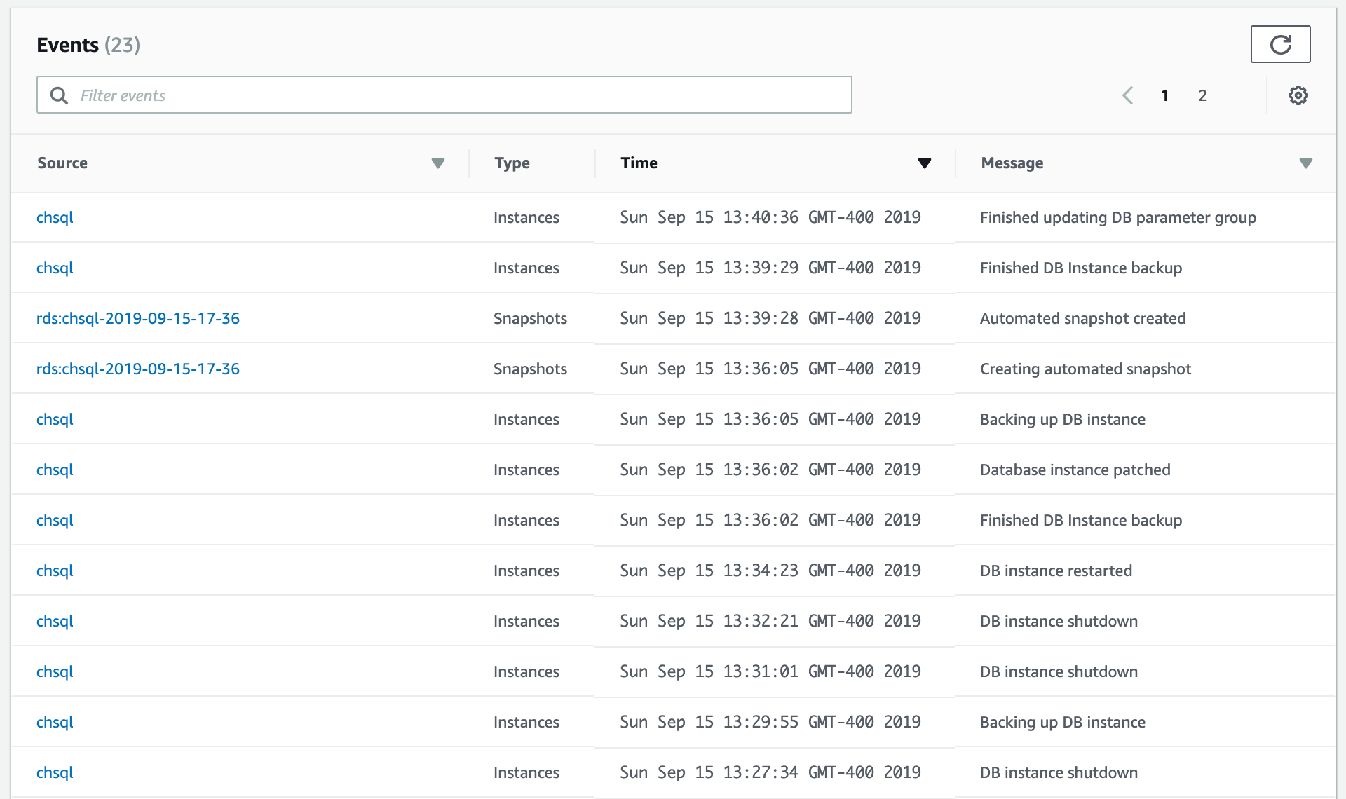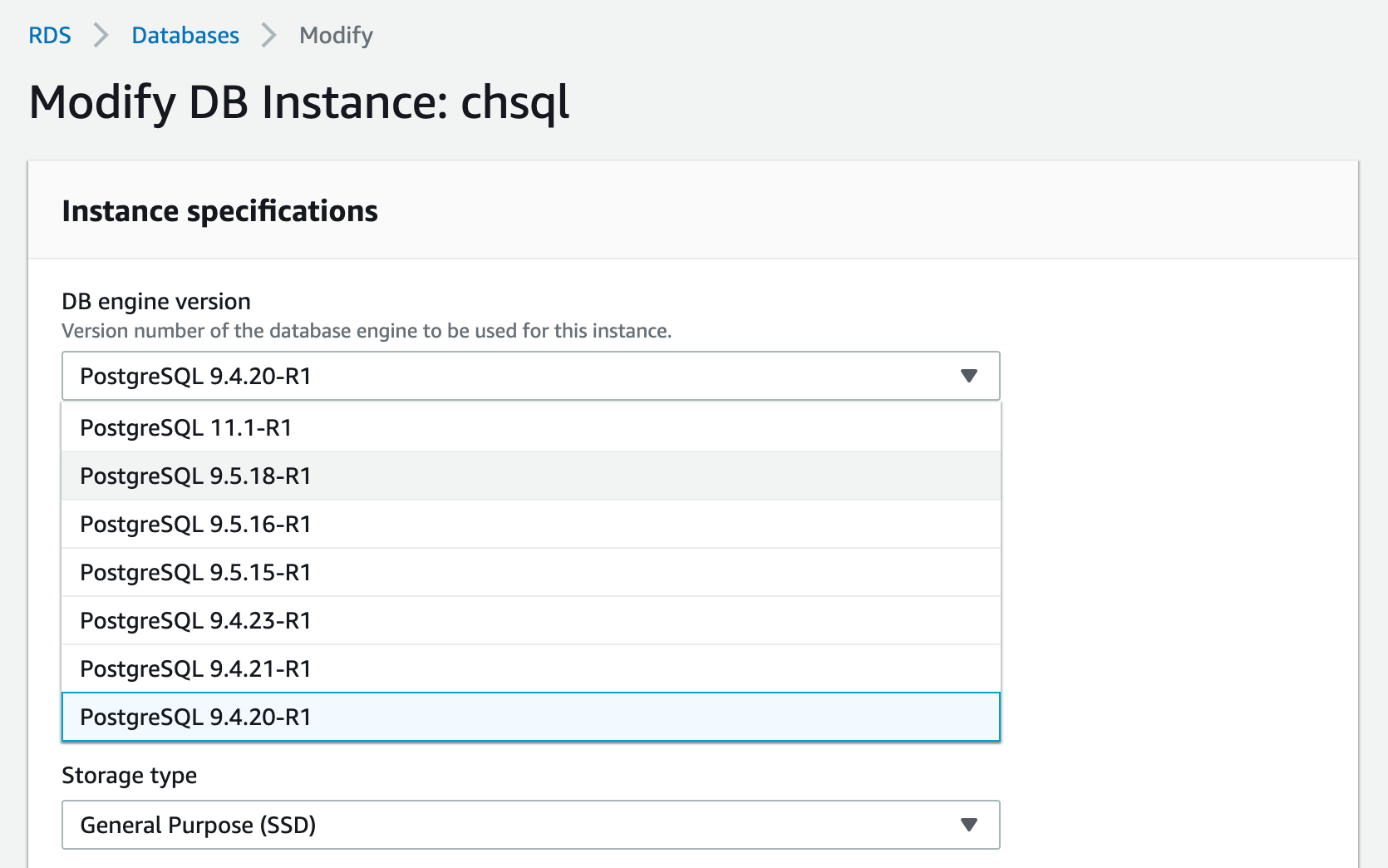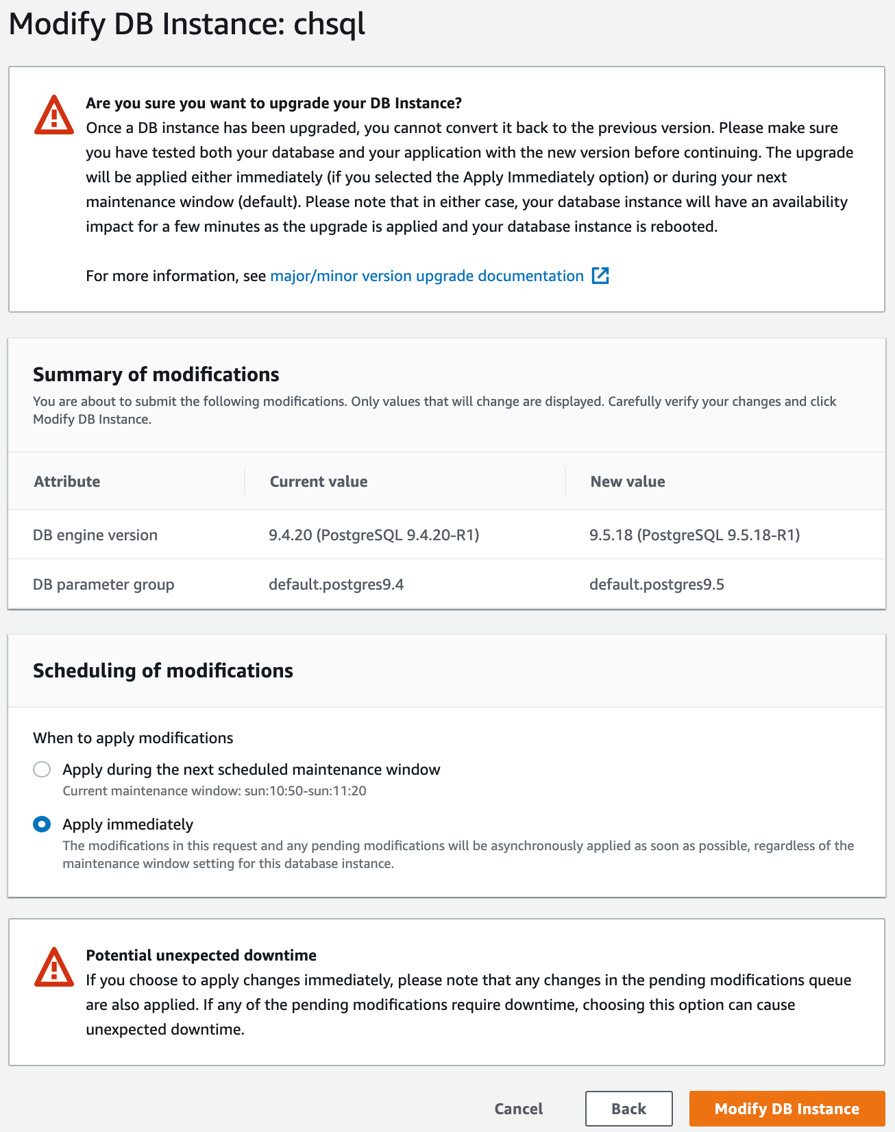 If there are any issues during the upgrade, you'll see the error messages appear in the event log. Once the database becomes 'Available' again in the Databases list, you can verify that the database was successfully upgraded by connecting to it, and running the SELECT version(); or through the AWS Console RDS Databases list by clicking on the database, and going to the 'Configuration' tab, under 'Engine Version'. At this point, you should see 9.5.18.