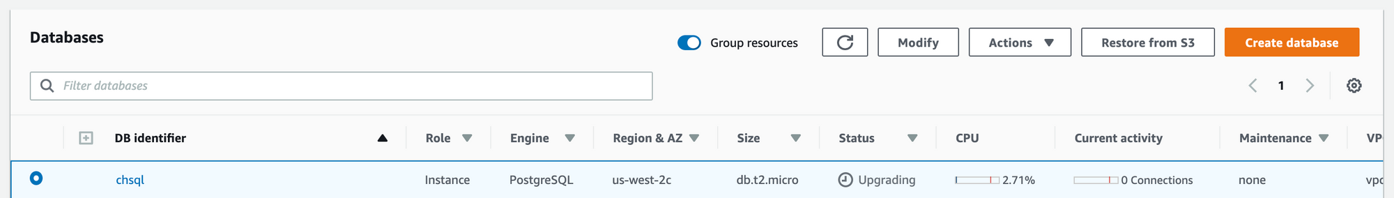 You'll want to 'Apply immediately' since this is your test instance. There's no time like the present! Then, accept this upgrade by clicking the 'Modify DB Instance'. Back on the RDS Databases page, you'll see that your database is now being upgraded: