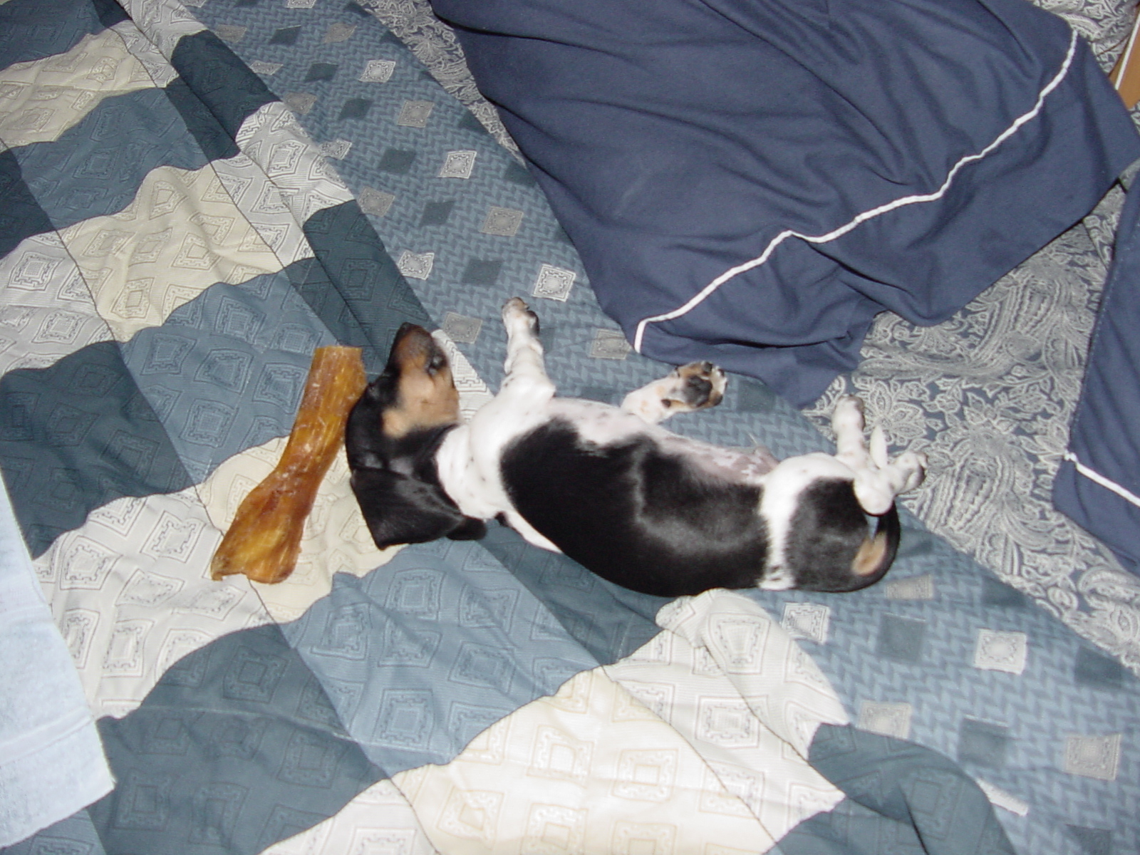 Before moving to Germany, I often thought about getting a Dachshund of my own. My parents and I had a family Dachshund during my teens and early twenties whom I loved dearly. I really like the personality of the breed. One afternoon in 2002, a friend of mine and I were discussing dogs; I shared my desire to have one, and she suggested names for my future pooch, one of which was Bentley. I really liked that name and it stuck with me. After I moved to Germany in early 2003, I picked up a Stars and Strips newspaper. Inside was an advertisement for Dachshund puppies, and I decided to investigate.