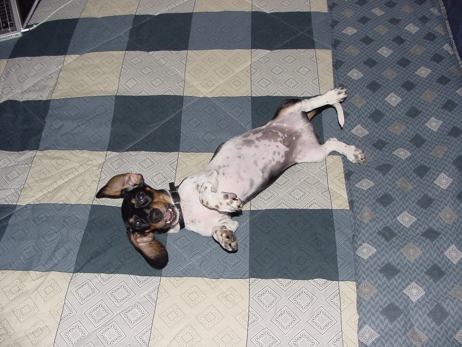 That first drive from Frankfurt to Giebelstadt was very memorable because it was my second road trip through the scenic German countryside. I couldn’t know then how important that trip was, or that I would make a decision that day which would have such a significant impact on my life for fourteen and a half years to come. Once I arrived at the Dashing Dackels farmhouse, the owners greeted me warmly and welcomed me into their home. We sat down in their living room where an adorable litter of puppies was playing inside a gated playpen. During the course of our conversation, they opened the pen, freeing the newborn dachshunds from their confines. Bentley was very tiny, being between six and eight weeks old. He had the most visually striking colors in his litter, with sharply defined, vibrant black, white and brown patches. I noticed him right away, and thought he was the cutest one in the pack. This is the first time I had ever seen a piebald Dachshund, as I was more accustomed to the black and tan variety. I remember that he still didn’t have his full eyesight at that time, as he crawled instinctively out of the pen into the vast expanse of the living room with his brothers and sisters.